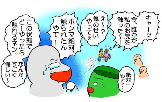 おめんさんの横を、自転車に乗った二人組みの女の子がスイ〜ッと通りすぎたかと思ったら、次の瞬間、「キャーッ!!」 と悲鳴が上がったではありませんか!!