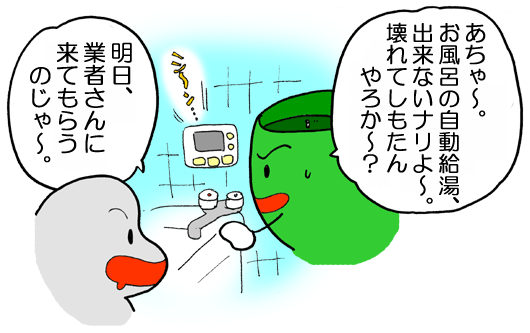「あちゃ〜。この給湯器あたらしいのに、もう壊れてしもたんやろか?」