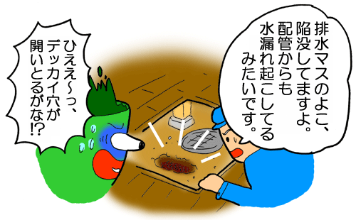 漏水 → 排水管の亀裂 → 地面陥没 …ときて、最後は我が家が「欠陥住宅」であることまで発覚してしまったワタクシ。