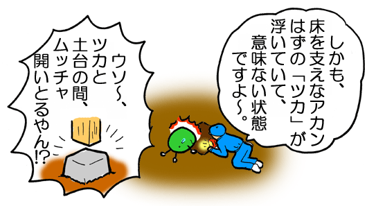 床下で家を支えなアカンはずの「ツカ」が、土台から浮いとるがな〜!!(しかも、数箇所!) |