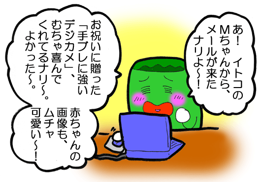 「『手ブレ補正してくれるデジカメ』を贈ろう!! これだったら、赤ちゃんがハイハイしだしても、キレイに撮れるしね!!」
