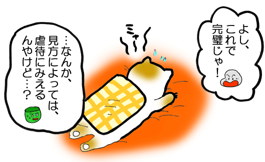 | ハンドタオルに包まれたカイロを、掛け布団にするのは、どうかと思います…。 |