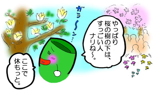「この木、何の木か知らんけど、ムチャクチャきれいな花が咲いてるやん。ここでいいや〜」