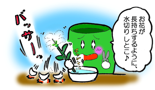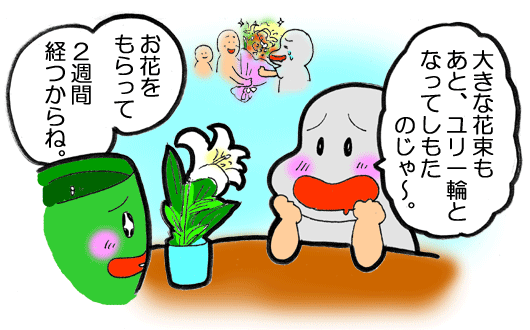 お茶のこは、ユリの花をそっと花瓶から出すと、水を張った洗面器につけました。