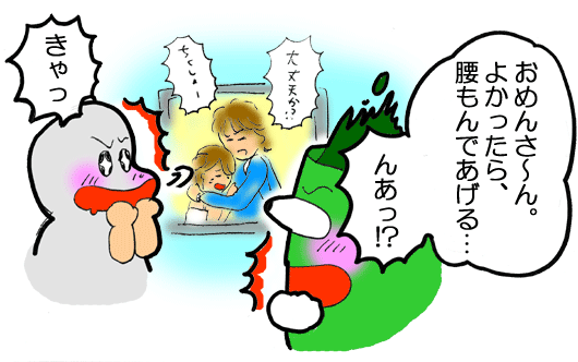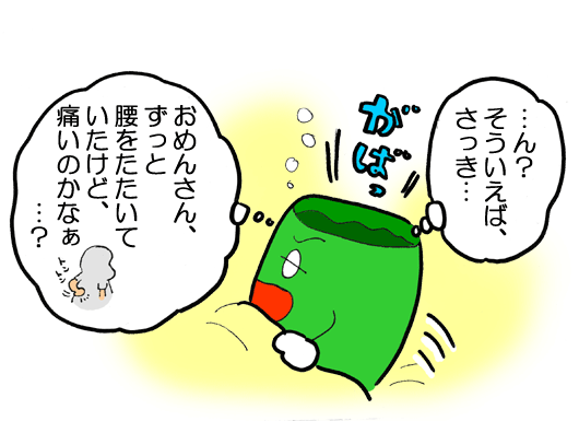 夢の世界に足を入れかける瞬間、ふと、腰をトントン叩くおめんさんの姿が浮かんできました。 |