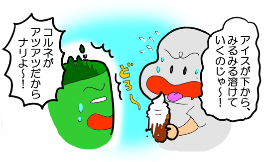 ワタクシ達は嬉々と受け取ると、上のアイスを食べ始めました。しばらくすると…。 |