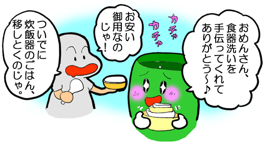 「炊飯器のごはん、容器に移しておくのじゃ〜」