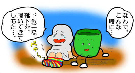 | こんな時に限って、おめんさんが派手な靴下を履いてきてしもた〜っ! |