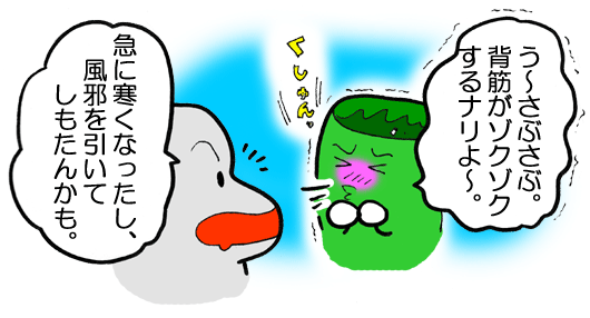 急に寒くなったせいか、朝起きると背筋がゾクゾク・くしゃみも連発で出てきました。それを見た おめんさん。