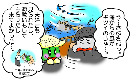 「風がキツイけど、いい天気で良かった〜。夫婦岩も見られたし、お祓いもタダでしてもらったし〜。むっちゃラッキー・いいことありそう♪♪」