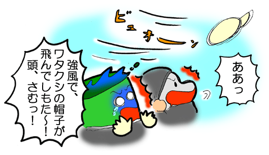 | 強風で、帽子が飛ばされてしもた〜!! |