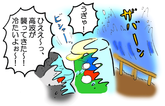 高波が崖を越えて、襲ってきたやん〜っ!!