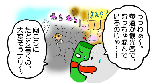 お土産屋さんの建ち並ぶ参道は、観光客でごった返しており、なかなか前に進めない状態でございました。